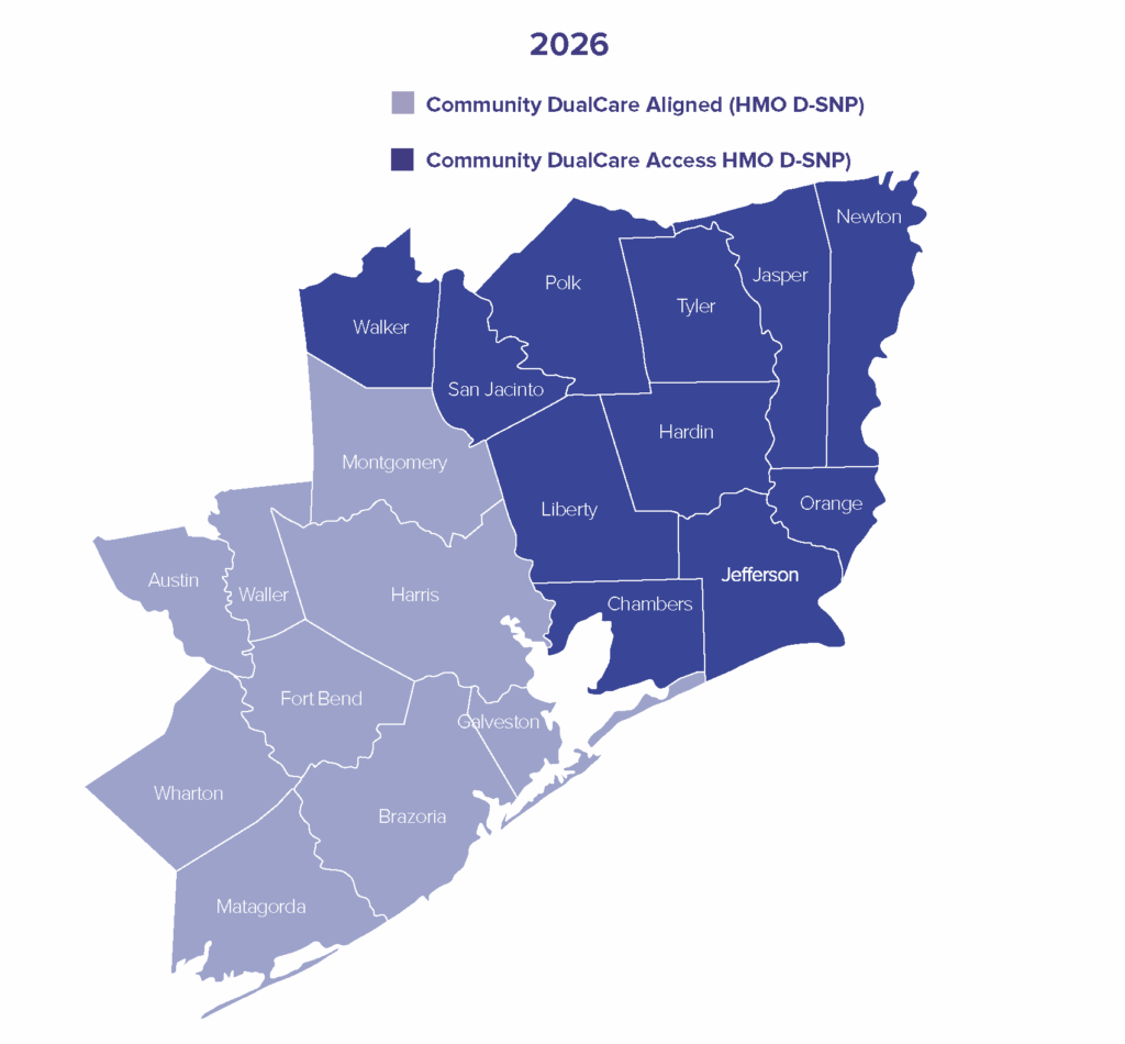 The Texas counties in the service areas covered by Community DualCare Aligned (HMO D-SNP) in 2026